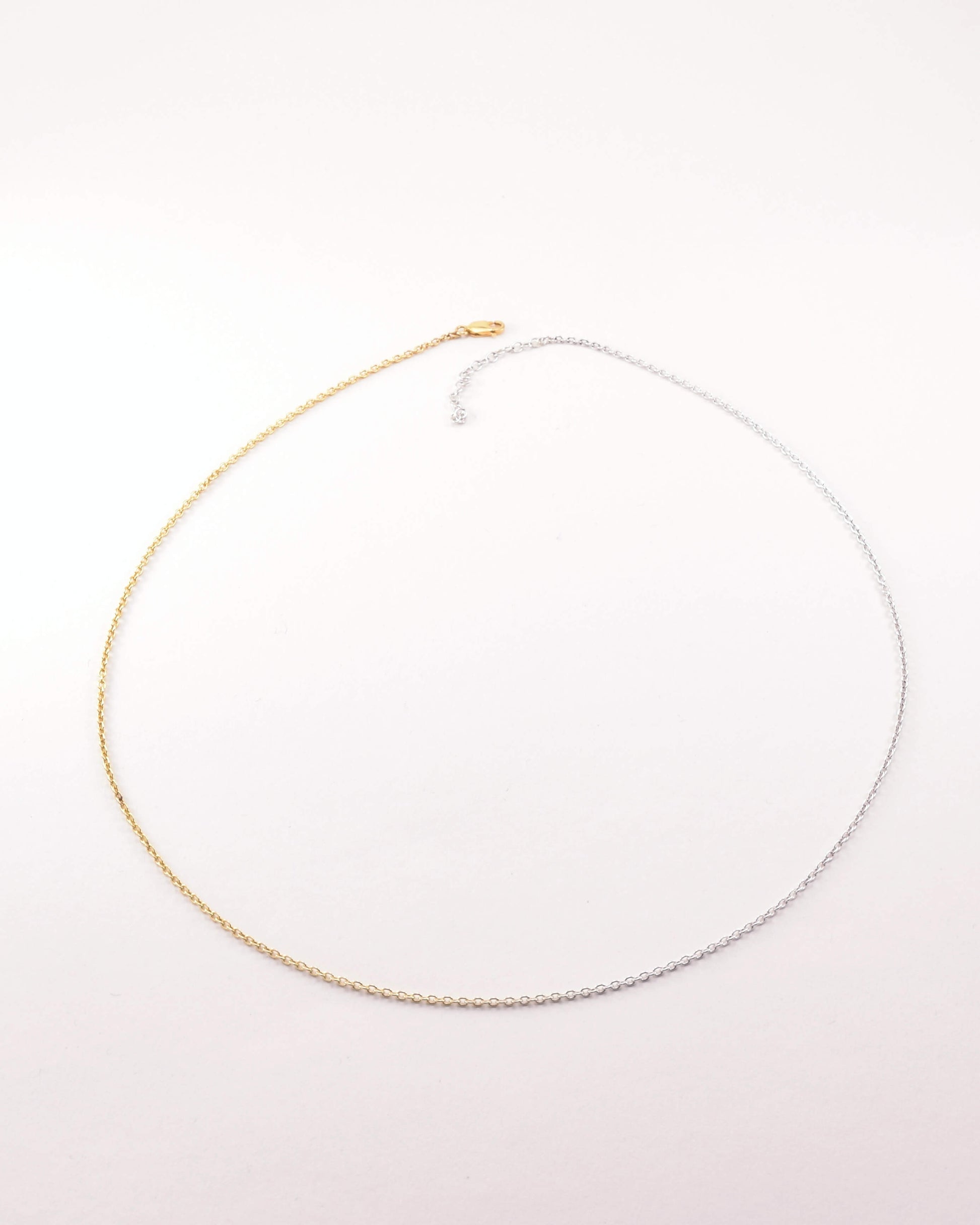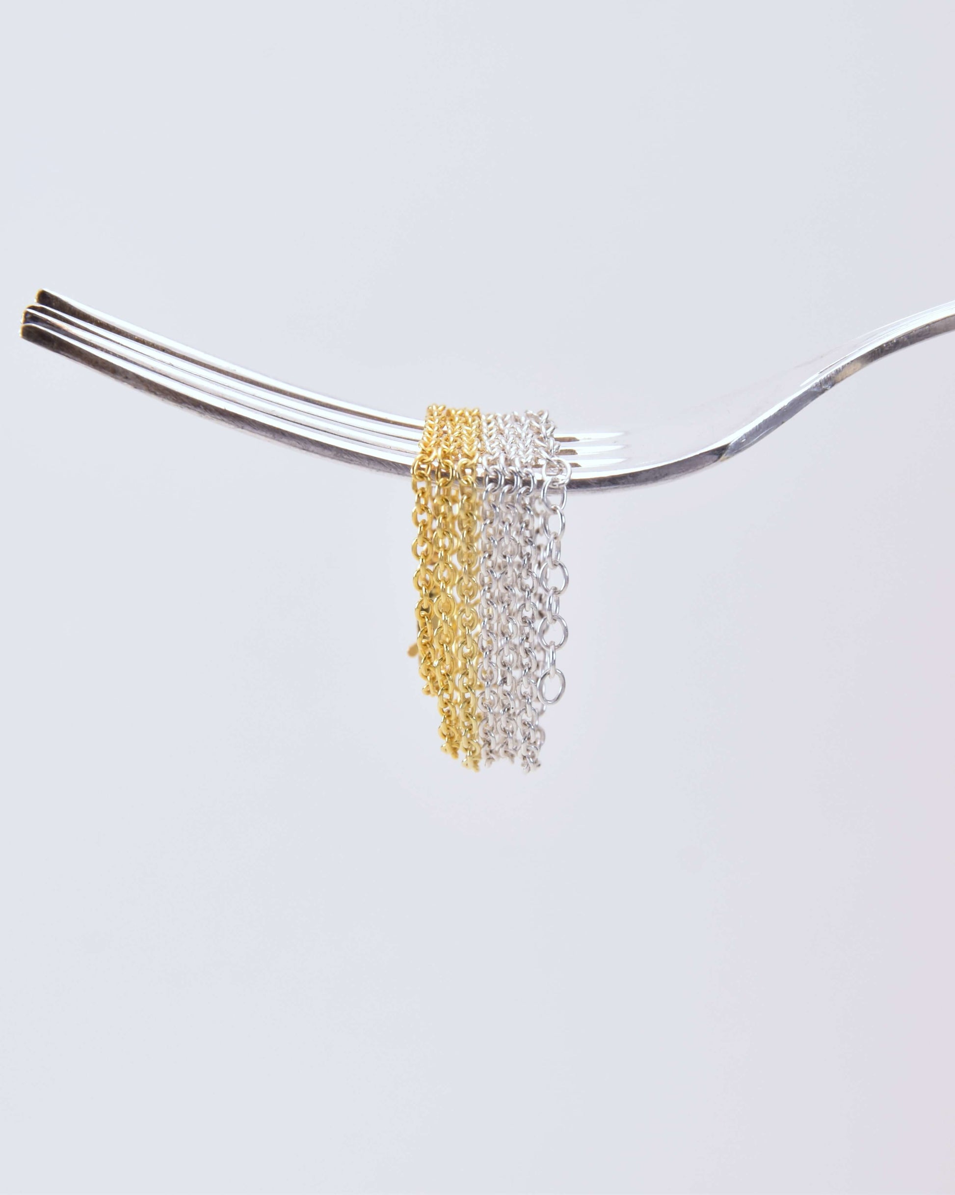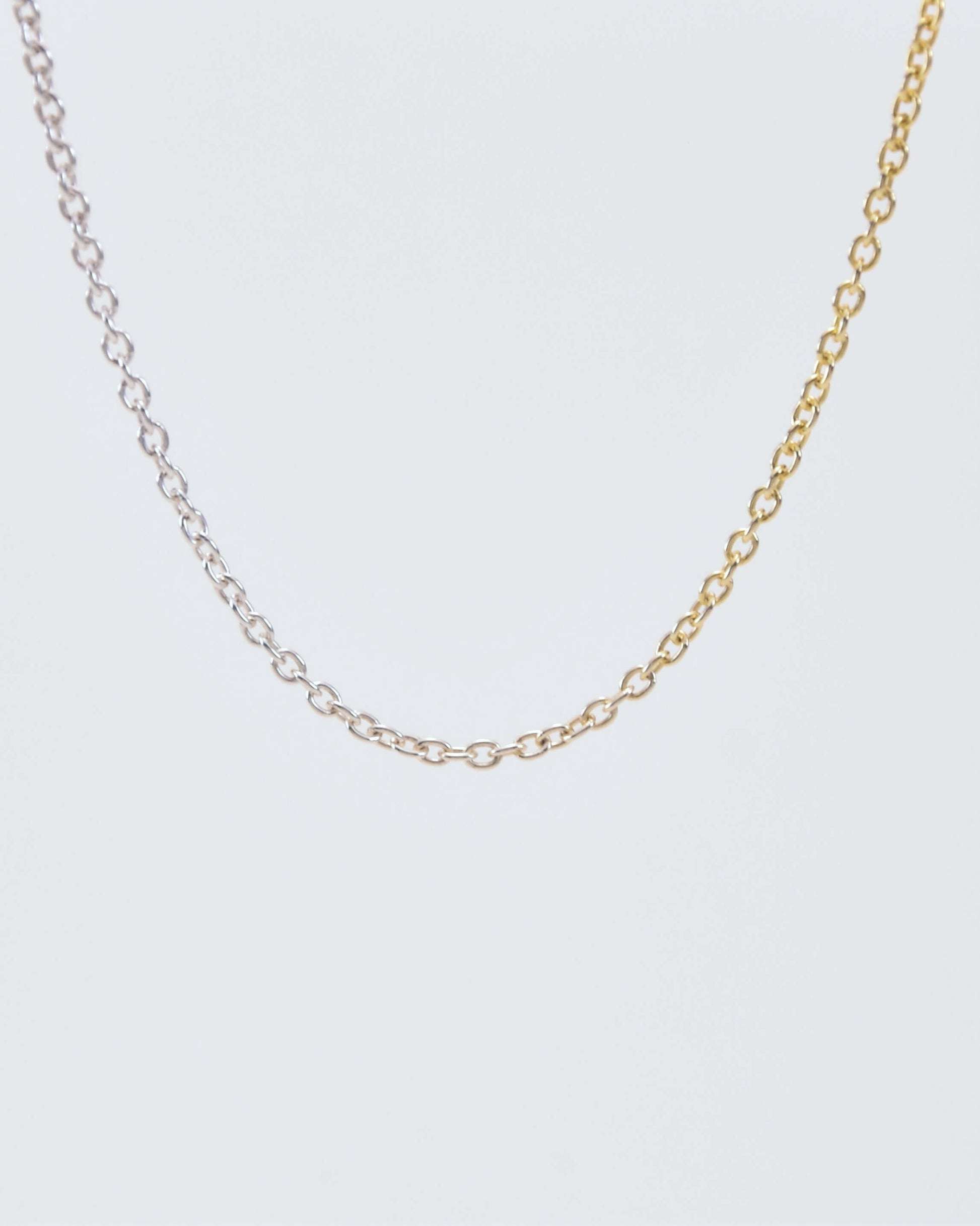 Diese Kette spielt mit Kontrasten: Vergoldet und versilbert im Verlauf, montiert auf einer stärkeren Ankerkette. Die Oberfläche bleibt klar, der Wechsel ist dezent. In München handgefertigt – ein modernes Bicolor-Unikat, das Material und Form in Balance bringt.