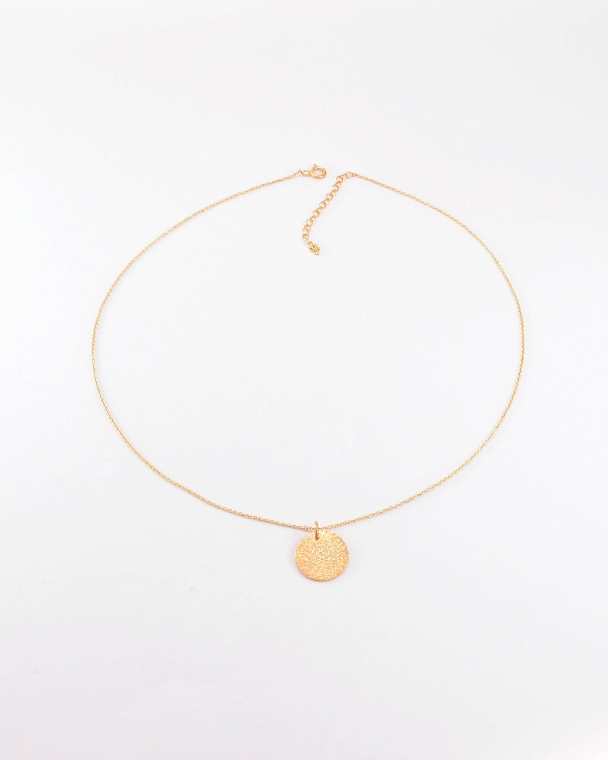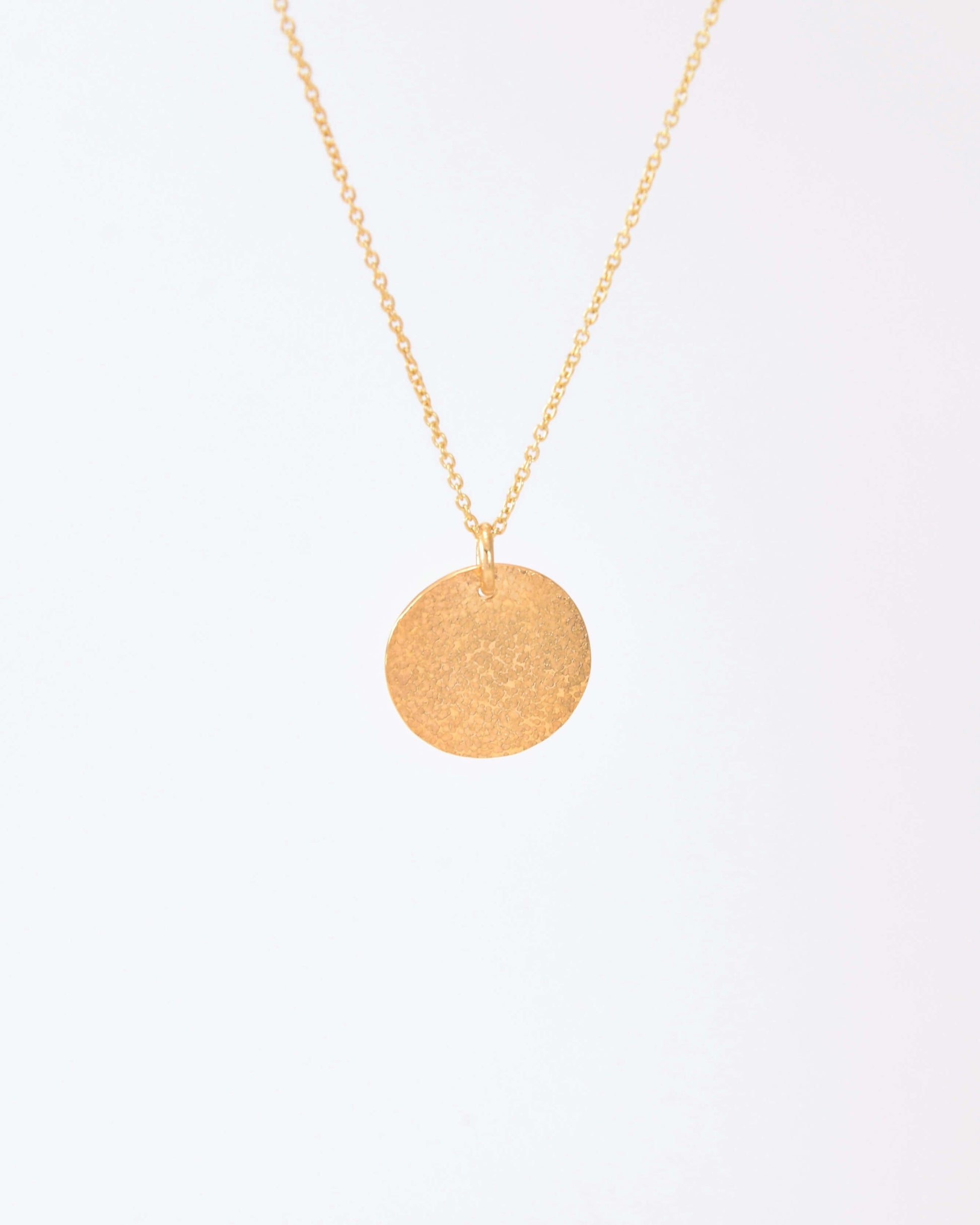 Quadratisch gehämmert und mit sichtbarer Struktur: Diese Münze wird zum Anhänger auf einer Ankerkette. Die Oberfläche bleibt lebendig, das Stück wahlweise vergoldet mit 24 Karat oder versilbert. Handgefertigt in München, auf Bestellung gefertigt.
