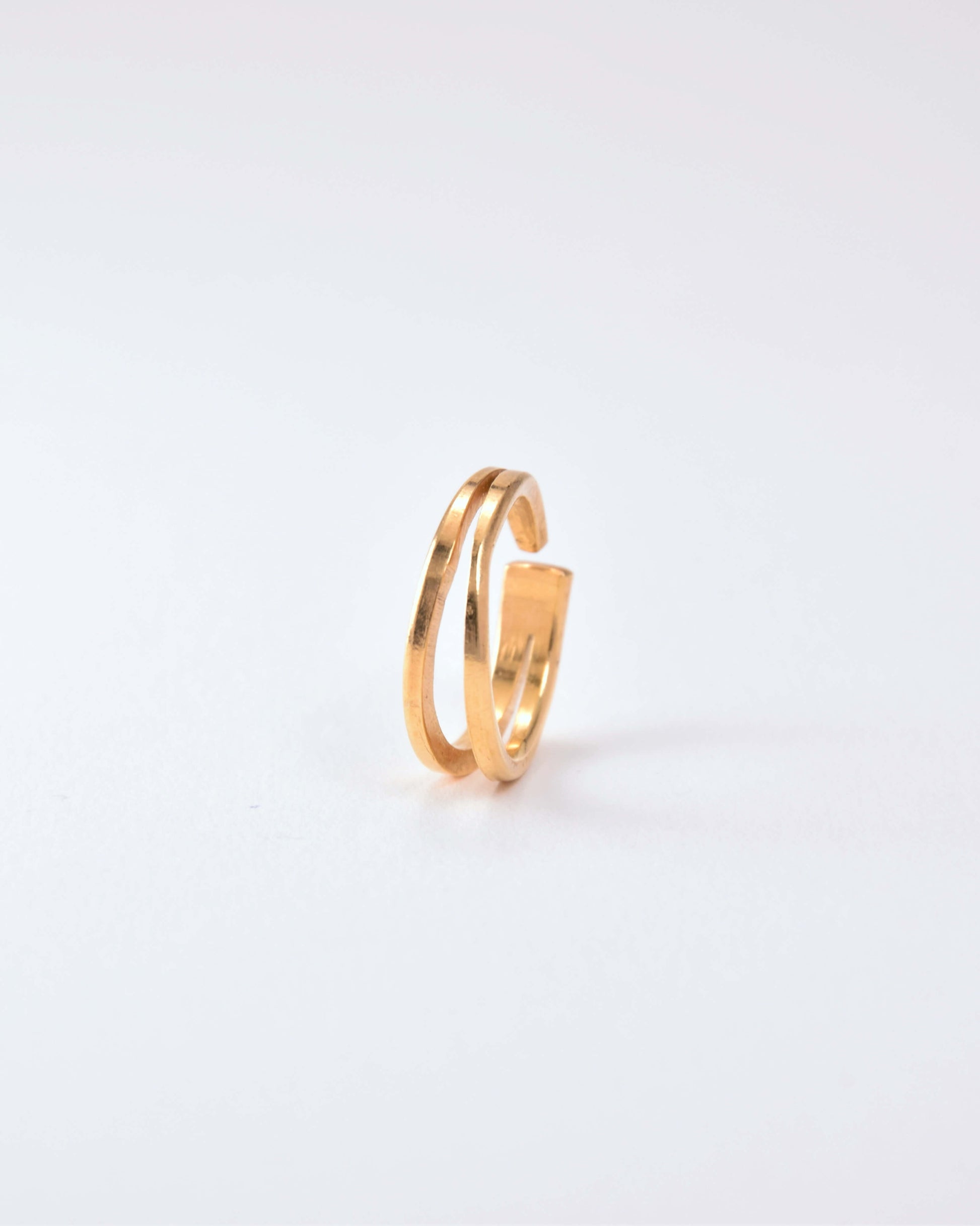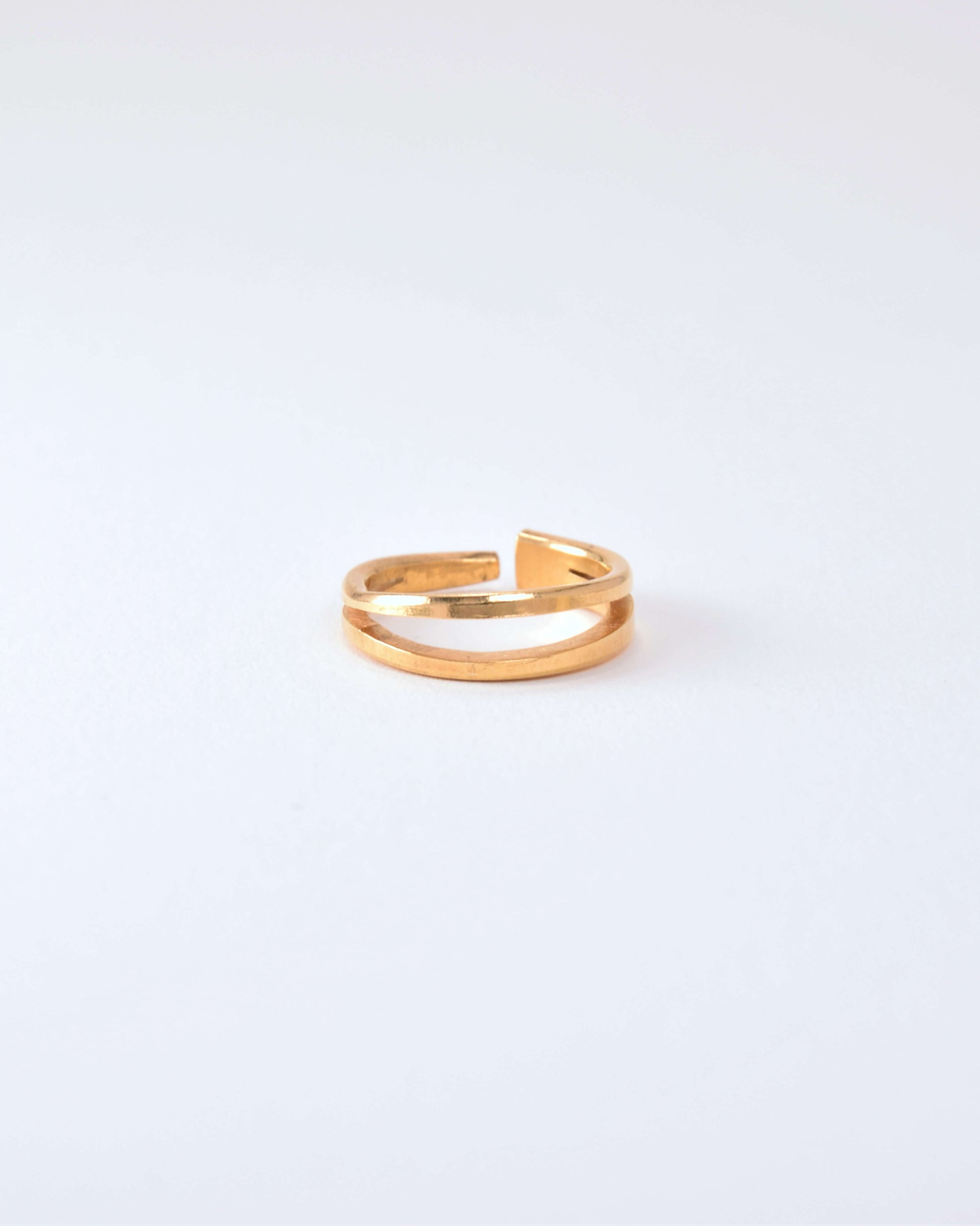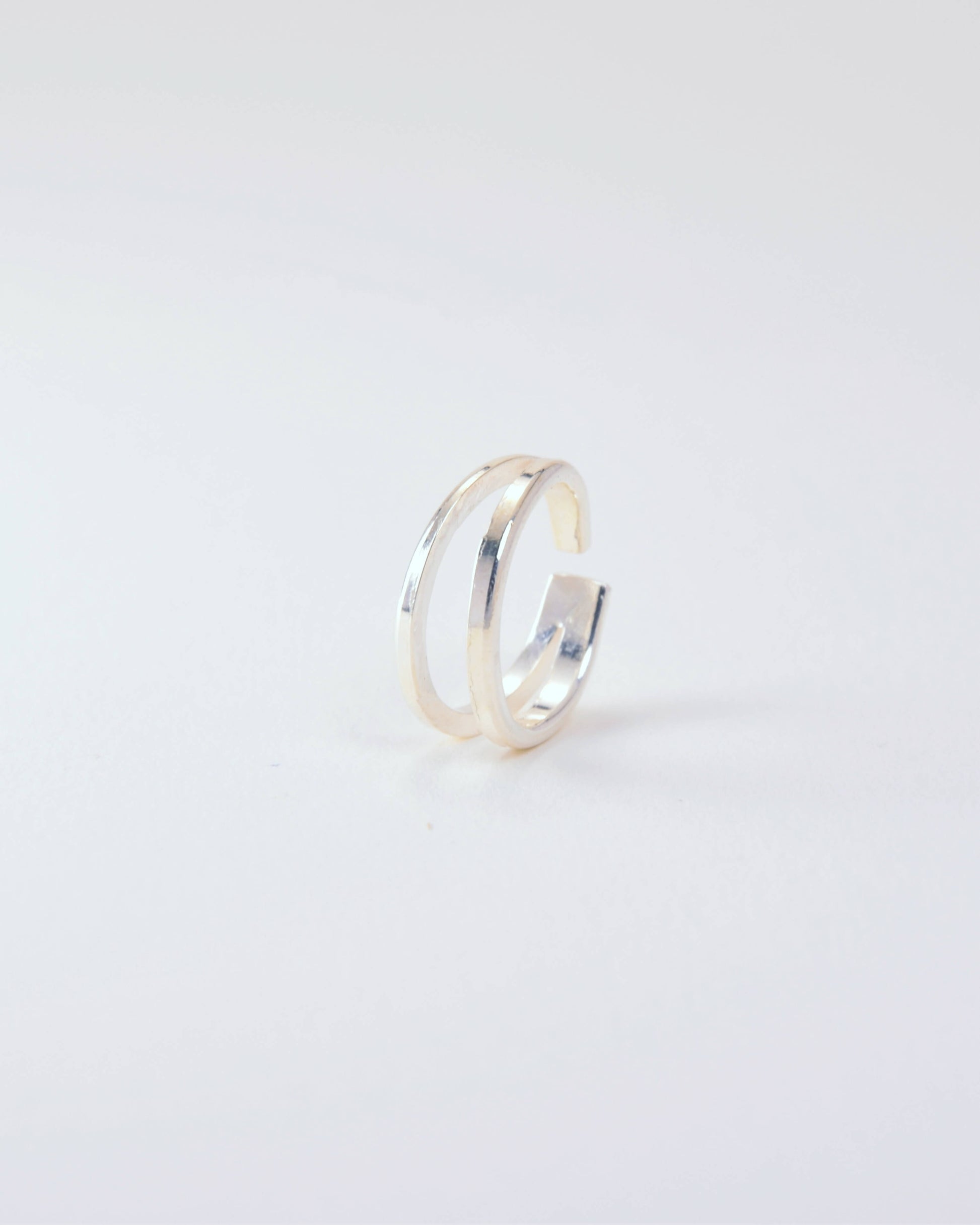 Von vorn erinnert dieser Ring an zwei feine Linien, die sich nebeneinander um den Finger legen. Geformt aus einer eingeschnittenen, geöffneten Gabelzinke, verbindet sich die Form am Ende zu einem ruhigen Kreis. Glatt geschliffen, veredelt mit 24 Karat Gold oder Silber – handgefertigt in München.
